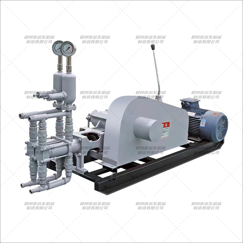 雙液變量注漿泵主要用于軟基加固,隧道預(yù)注漿,堵水及破碎巖石的固結(jié)注漿工程。 SYB-140/6型雙液變量注漿泵為臥式雙作用往復(fù)式活塞泵,該泵為雙進(jìn)雙出泵,有兩個(gè)吸漿口,兩個(gè)排漿口,可進(jìn)行雙液注漿作業(yè),出漿比例1:1,注漿速度由變速箱控制分4種速度,對(duì)應(yīng)不同的出漿排量,由于該泵兩缸同時(shí)輸出漿液,通過(guò)混合器,混合可達(dá)到較準(zhǔn)確的混合比例,對(duì)漿液的凝膠時(shí)間更容易控制,從而能有效地掌握漿液的擴(kuò)散半徑,進(jìn)而提高注漿工程的質(zhì)量,降低注漿工程的成本。 1.雙缸雙液注漿泵的壓力高,流量大。 2.雙缸雙液注漿泵可任意比例注兩種漿液。 4.雙缸雙液注漿泵采用液壓機(jī)械換向,無(wú)復(fù)雜電器元件,基本無(wú)易損件,操作方便,動(dòng)作可靠。 5.雙缸雙液注漿泵現(xiàn)場(chǎng)操作人員即可熟練操作,方便維護(hù)和維修。